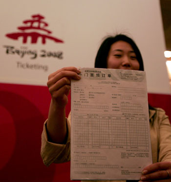 Beijing Olympics tickets go on sale(BOCOG)Updated: 2007-04-15 13:30 BEIJING - More than seven million very affordable tickets are now on sale for the 2008 Olympic Games in Beijing, the Beijing Organizing Committee for the Games of the XXIX Olympiad (BOCOG) announced on Sunday. About 75% of the tickets will be sold domestically and the rest will be available to the overseas public.