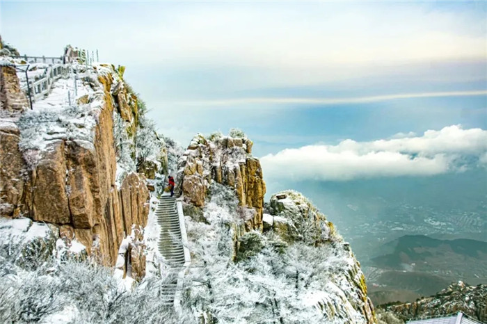 Stairs dusted with snow lead visitors through this frozen fairy tale on Taishan Mountain. [Photo/WeChat account: SDTXTA]