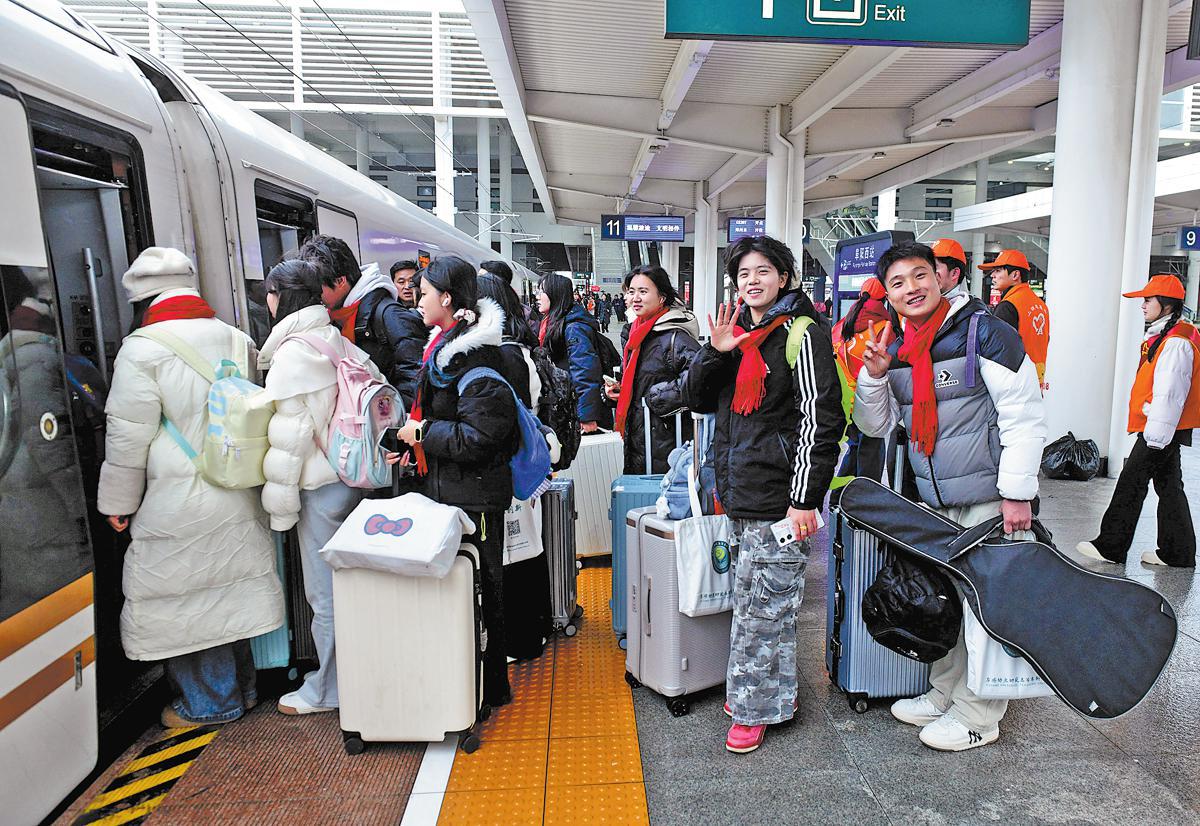 College students wait to board train number G7723 at Fuyang West Railway Station in Anhui province on Jan 19, 2026. The train, carrying over 300 local students home for the winter vacation, marked the first student group charter service in the Yangtze River Delta region in 2026. WANG BIAO/FOR CHINA DAILY