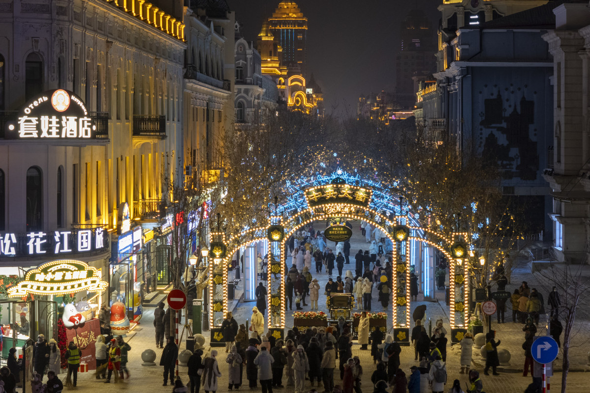 A drone photo taken on Jan 12, 2026 shows people visiting the Central Street in Harbin, Northeast China's Heilongjiang province. As one of the most popular attractions in Harbin, the Central Street, which is renowned for its diverse European-style architecture, wows tourists with its colorful lights at night during the city's tourism boom this winter. [Photo/Xinhua]