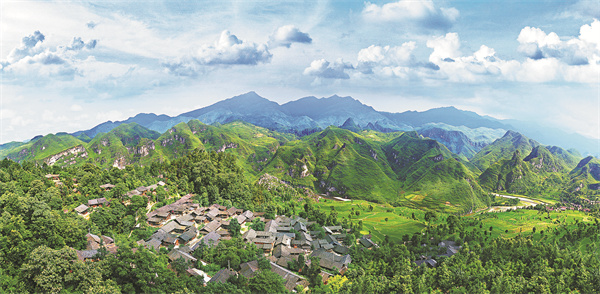 A bird's-eye view of Loushang village in Guizhou province, nestled between mountains and a river.[Photo provided to China Daily]