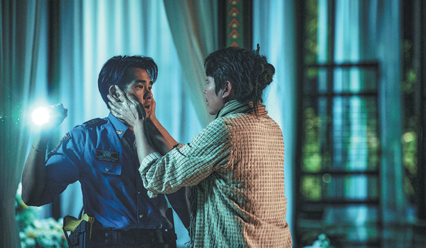 A scene from the new crime comedy Busted Water Pipes featuring actors Eddie Peng (left) as an overachieving police officer, and Ai Lun as a fugitive disguised as a spiritual mentor. CHINA DAILY