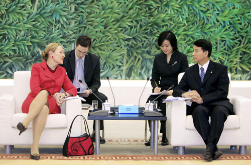 EU Commissioner for External Relations Benita Ferrero-Waldner (L) and Chinese Vice Minister of Commerce Yi Xiaozhun speak before taking part in the signing of agreements between China and the EU to create a law school meant to improve their understanding of each other's legal systems at a ceremony in Beijing, January 17, 2007. [Reuters]