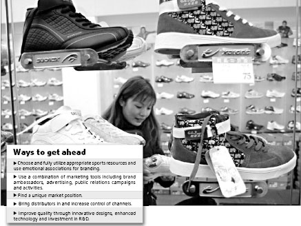 Thus, how to take the opportunity to market brands and products has become a top priority for domestic sportswear makers. With the rise of Chinese athletes on the international stage, the country's sportswear business has also flourished. But challenges remain. If we divide the current sportswear market into three tiers, Nike and Adidas have a tight grip on the premium segment, while Lining is in the second tier and other local makers like Anta occupy the majority of the low- and medium-end segments. Domestic brands are faced with the challenge of moving up the value chain and going global. Lining, named after the famous Chinese gymnast, opened its first overseas outlet in Spain in 2001. It signed the Spanish basketball team, the world champions in 2006, and partnered with the national basketball team of Argentina. But its overseas revenue has remained at 700 million yuan. In the high-end market, it faces attacks from Nike and Adidas. Sports footwear makers in East China's Fujian Province have had a difficult time differentiating themselves since rival Anta achieved popularity in 2000. Goals of becoming global premium brands have been thwarted by price wars. Most of the companies are either contracted manufacturers for international brands or they struggle with meager sales in developing markets. Branding dilemma Local companies are also facing a marketing and branding dilemma over whether to invest in TV commercials and sign up sports stars as brand ambassadors. In 2000, Anta spent a huge amount of money advertising on national broadcaster CCTV, using former table tennis champion Kong Linghui as its representative. The exposure helped the company achieve great success in the domestic market. Other sportswear firms followed suit, spending tens or even hundreds of millions of yuan on TV commercials featuring sports or entertainment stars. This strategy can bring short-term success, but often only the faces of the stars stick in the minds of consumers, rather than the brands. Many sportswear companies focus on basketball and are unsure about whether to position their brands as professional sportswear or fashion. Basketball is the No 1 sport in China. But with so many companies signing
