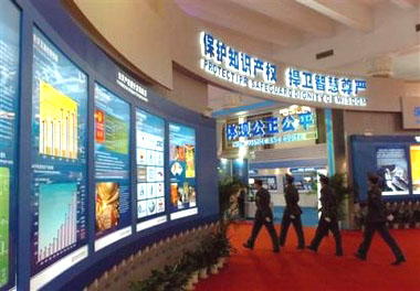 Security officers enter the Exhibition of China's Achievements in Intellectual Property Protection which opened in Beijing Sunday, April 16, 2006 ahead of Chinese President Hu Jintao's visit to the United States. [AP Photo]