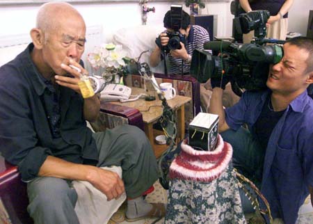 A robot lights a cigarette for an old man. [newsphoto.com.cn]