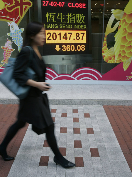 past a panel displaying the closing Hang Seng Index in Hong Kong February 27,