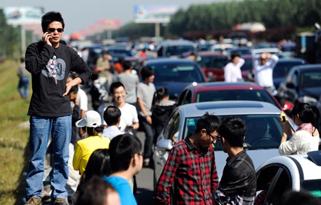 Heavy traffic on main expressways has ignited criticism about the government's decision to abandon the use of tolls during the "Golden Week" holiday.