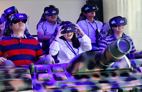 Media persons attending the Internet Media Forum & China-Russia New Media Youth Leadership Summit experience virtual reality devices manufactured by NINED VR in Tianhe district, Guangzhou, South China's Guangdong province, Oct 28, 2016. The company specializes in developing innovative technologies and business models, such as VR hardware R&D, VR content production and production of VR entertainment equipment. So far, the company has set up a 200-member content R&D team and established 3,000 offline VR experience stores across the country. [Photo by Zhu Xingxin/chinadaily.com.cn] |