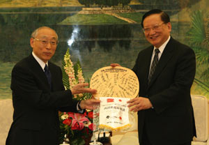 Councilor Tang Jiaxuan (R) is presented a table tennis bat by Koji Kimura,