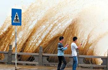 not deterred by the huge waves Wednesday, May 17, 2006.(Xinhua)