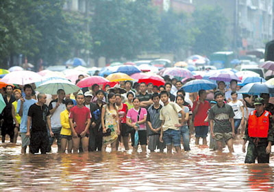 in knee-deep flood water in Bishan County, southwest China's Chongqing