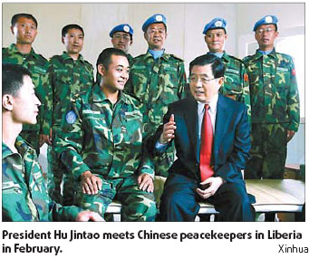 The body of the Chinese victim, Du Zhaoyu, was found the next day in the rubble, together with three other observers from Finland, Austria and Canada. Du, 34, a lieutenant colonel in the People's Liberation Army, was killed six months into his tour of duty as a UN observer in the Middle Eastern country. He was born in Jinan, capital of East China's Shandong Province, and was the father of a 1-year-old son. Du was the eighth Chinese soldier to be killed on duty on a UN peacekeeping mission since the nation started participating in UN peacekeeping operations in 1990. Fu Qingli gave his life in the Democratic Republic of the Congo in 2005 when he fainted suddenly while washing the mud from a loader. In his application to become a peacekeeper, Fu writes: "I was told peacekeeping is a very difficult and risky mission, particularly in a war-torn country like the Democratic Republic of the Congo, but I don't fear that. "It is worthwhile to devote Chinese servicemen to world peace, even if it means losing my life." China has contributed about 7,500 peacekeepers to United Nations peacekeeping operations since 1990, according to the Peacekeeping Affairs Office of the Ministry of Defense. Apart from these eight deaths, several dozen others have been injured on peacekeeping missions. Currently, 1,643 Chinese peacekeepers are serving on UN missions in the countries including the Democratic Republic of the Congo, Liberia, Lebanon and Sudan. The majority of them are engaged in engineering, transportation and medical services. In Sudan, 435 Chinese peacekeeping troops are in service, including 275 military engineers, 100 transportation staff and 60 doctors. There are also about 100 Chinese serving as military observers and staff officers in 10 mission areas. In February, President Hu Jintao met Chinese peacekeeping troops in Liberia and southern Sudan and put forward a four-point principle for the solution of the Darfur issue, which includes a peaceful solution through dialogue on an equal footing, improving living conditions, and respect for sovereignty and territorial integrity. Hu's visits and proposal indicate that China attaches great importance to the peacekeeping missions, Dai Shao'an, vice-director of the Peacekeeping Affairs Office of the Ministry of Defense, tells China Daily. In addition to its current commitments, China plans to send a 275-member engineering unit of peacekeepers to Sudan in the near future. China has strict selection criteria for its peacekeepers. English proficiency and physical stamina are among the basic requirements, along with expertise required for the specific mission. "Knowing that they are helping to secure peace and a normal life, our soldiers take their peacekeeping duties very seriously. And wherever they go or whatever they do, they always bear in mind that they are messengers of peace, representing China," Dai says. "This sense of responsibility and dignity naturally lead to good deeds." Chinese peacekeepers have built more than 7,300 kilometers of roads and 200 bridges, treated more than 28,000 patients, performed more than 230 surgical operations, transported materials more than 3 million kilometers and cleared more than 7,500 explosives, according to statistics from Dai's office. To honor Chinese peacekeepers' contributions, many roads and bridges have been named after the nation in the Democratic Republic of the Congo and Liberia. But the word "China" is not only to be found on some signs, it is also ringing in the ears of Dai, who frequently visited places where Chinese peacekeeping troops are stationed. "When local people in Africa see me in uniform, some of them began to shout 'China, China' and gave me the thumbs up," Dai says. "Some children even salute me the way Chinese soldiers do," he adds. Dai has visited the Democratic Republic of the Congo, Liberia and Lebanon - three places where China has more than 1,000 peacekeepers. Dai says he was shocked to see how wars and conflicts have shattered local people's lives and how urgently they needed a helping hand to rebuild their homes. While dispatching peacekeeping staff, China also offers the facilities and professionals required to meet local people's needs. Since rebuilding the country after a series of long and destructive conflicts was the top priority in the Democratic Republic of the Congo, China sent an engineering unit and a medical team there to meet the most urgent needs. In southern Lebanon, where mines are the biggest concern, China has sent demining equipment and a team of demining experts. "Unlike highways in China, on which your truck can run more than 100 kph without causing any damage, it often takes hours to cover 10 kilometers because of the poor road conditions," Dai points out. "And any breakdown on the way could probably ruin the whole mission. So, we always purchase state-of-the-art equipment for our peacekeeping missions," he says. In Africa, one of the biggest challenges is how to prevent and treat malaria - the most common disease on the continent, which claims millions of lives annually. Thanks to the training programs they must complete before leaving for Africa, Chinese peacekeepers have been able to reduce the possibility of contracting diseases to an absolute minimum. And most of those who actually fell ill were medical staff who were infected during their exposure to patients. "To ensure the safety of our peacekeepers and increase the effectiveness of the assigned mission, an inspection team will be sent to the target areas to check the working and safety environment before our peacekeeping soldiers go there," Dai says. "After our peacekeepers arrive there, they will update their information database so they can follow closely the development of the situation," he says. "To win hearts and minds, you need to devote your own hearts and minds, and that is exactly what our peacekeepers are doing." China is ready to send as many peacekeeping troops as it can to stop violence or