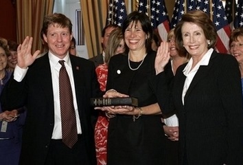 Speaker of the House Nancy Pelosi, D-Calif., right, stands with newly sworn in Rep. Don Cazayoux, D-La., left, and his wife Cherie, center, during a mock swearing-in on Capitol Hill in Washington, Tuesday, May 6, 2008. [Agencies]