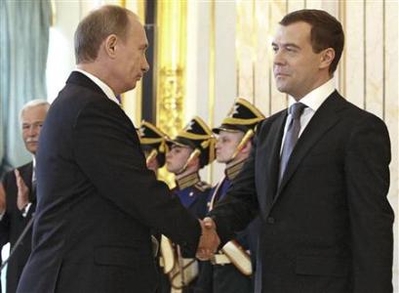 Russia's President Dmitry Medvedev (R) and former president Vladimir Putin shake hands during an inauguration ceremony in Moscow's Kremlinthrone room May 7, 2008. [Agencies] For more photos