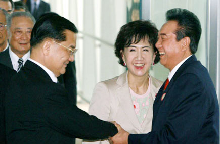 Director of the Taiwan Affairs Office of the CPC Central Committee, Chen Yunlin (R), greets KMT party honorary chairman Lien Chan in this April 28, 2008 photo. [China Daily]