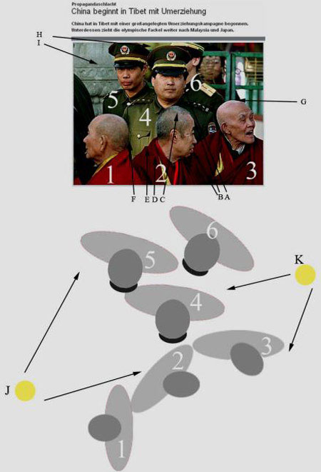 Figures 2 and 3 show light shining from the rear right area (indicated by mark K). That explains the highlighting on figure 2's lower lip and the outline light on his forehead (indicated by B), and also the outline light on the top and back of figure 3's head. Under the light from a same light source (K), the left part of figure 4's face and his left shoulder should be as bright as figure 2, but what is shown on the photo is just to the contrary. The faces of figures 4, 5, 6 indicate light from the front left (J), proven by the bright area on the right chest of figure 4.