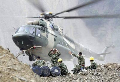 A military helicopter transporting soldiers and engineers prepares to land near the Tangjiashan quake lake area at earthquake-hit Beichuan, Sichuan province, May 27, 2008. [Agencies]
