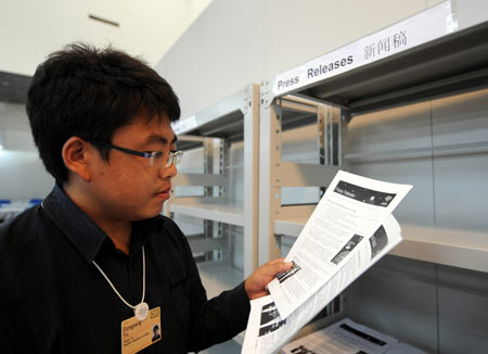 Updated: 2008-09-26 13:36 ![]() A journalist refers to press releases at the media center of the second Annual Meeting of the New Champions held by the World Economic Forum at north China's Tianjin Municipality, Sept. 25, 2008.[Xinhua] |