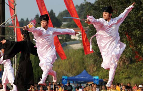 Yu Kuizhi plays in the Peking Opera classic The Ruse of the Empty City in Jiangxi province. Jiang Nan / China Photo Press |