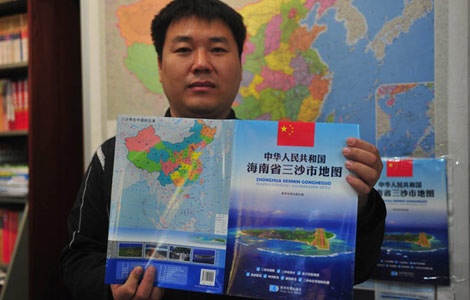 A staff member displays the cover of a thematic map on Sansha city in Xidan Book Building in Beijing, on Nov 24, 2012, the day of its debut sale.