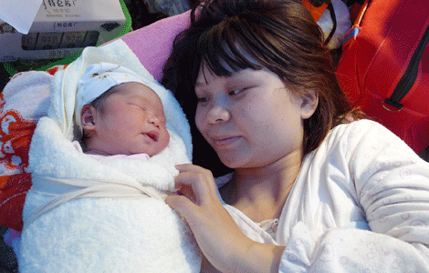 A mother gives birth to a baby at a makeshift tent set up at the People's Hospital of Ya'an, Sichuan province which was struck by a 7.0-magnitude earthquake Saturday morning.