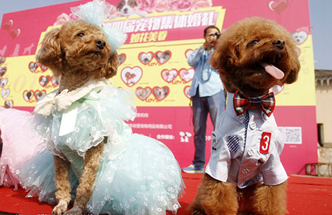A dog couple in wedding dress get married at a group wedding ceremony in Nanjing, East China's Jiangsu province, on Sunday. A total of 15 pair of dogs were given marriage certificates and exchanged love tokens at the ceremony. [Photo/IC]