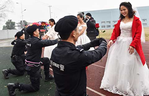 SWAT soldiers get ready to stop the rickshaws carrying their brides during a special wedding in Shaoxing, East China's Zhejiang province, Jan 10, 2016. A group wedding was held for 10 soldiers from a SWAT detachment of the city's public security bureau on Sunday, as they had postponed their weddings for their special work.[Photo/Chinanews.com]