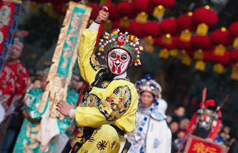 Actors stage a performance during a temple fair at the Temple of Marquis in Chengdu, capital of Southwest China's Sichuan province, Feb 8, 2016, first day of the Chinese Lunar New Year. [Photo/Xinhua]