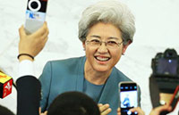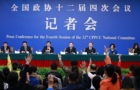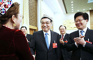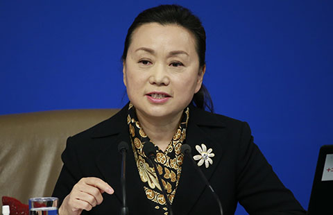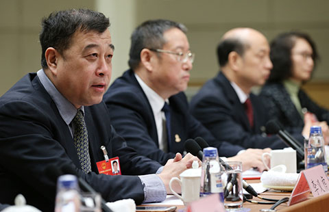 Tianjin mayor Huang Xingguo (left) and Zong Guoying, a senior official from the Binhai New Area of the city, attend a group discussion session that was open to reporters at the NPC's annual session in Beijing on Tuesday. |