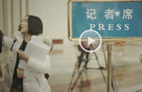 A network journalist holds a selfie stick as delegates arrive at the Great Hall of the People for the NPC annual session in Beijing, March 4, 2015. [Photo/CFP]