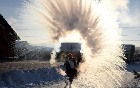 In recent days, the lowest temperature in China's northernmost county Mohe dropped to -40C. Tourists and the local residents enjoy seeing the spectacle of hot water freezing the moment it is tossed from a pot. [Photo by Chu Fuchao/for chinadaily.com.cn]