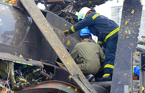 A military helicopter crashed into a residential building in Taiwan's Taoyuan County on Friday, injuring two pilots on board.