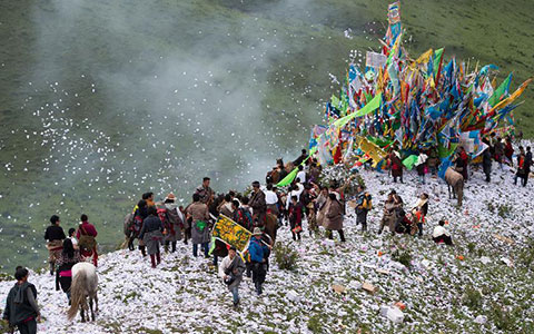 People of the Tibetan ethnic group celebrate the Burning Offerings Festival in Hongyuan county, Southwest China's Sichuan province, June 23, 2015.