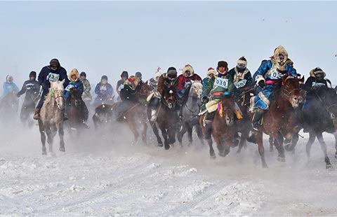 Horse racing competition at the Ice and Snow Nadam Festival on Jan 16, 2016. [Photo/CFP] |