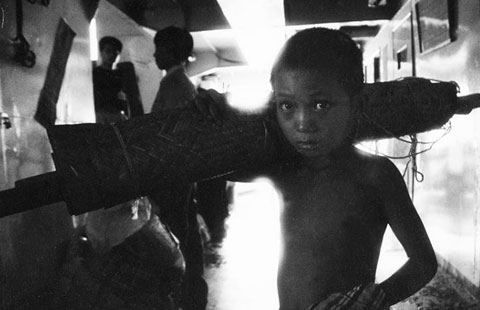 Seven-year-old migrant Liu Wei carried a sleeping mat as he moved from Xiangjia village in Zigui county, Hubei province by ship on June 25, 1995. The village was among the first batch to be relocated for the dam. All of the 184 residents from the village moved to a suburb of Yichang city in the same province. [Photo by Li Feng/chinanews.com]