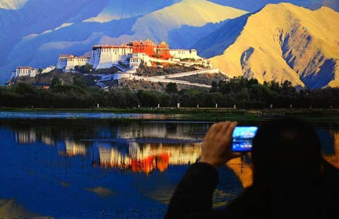 A visitor takes photo during a photography exhibition of Tibet in Shijiazhuang, capital city of North China's Hebei province, Jan 6, 2015. A total of 180 photos demonstrating the scenery and tradition of Southwest China's Tibet autonomous region were on display. [Photo/Xinhua]