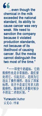 Yunwuxin: Like Luo Yunbo said, who is the dean of College of Food Sciences at China Agricultural University, even though the chemical in the milk exceeded the national standard, its ability to cause cancer was extremely weak. We need to sanction the company because it violated production standards, not because its likelihood of causing cancer. But the media cannot distinguish the two questions most of the time.