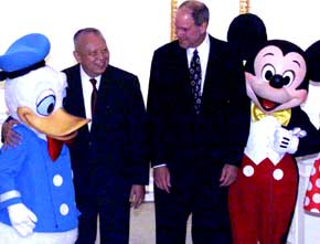 Disney Chairman Michael D. Eisner (right) and Hong Kong's chief executive, Tung Chee-hwa, are pictured with Walt Disney's animated animals during a reception at Government House in Hong Kong on Thursday. Eisner, in Hong Kong to promote the "100 Years of Magic" celebration, revealed that Chinese mainland may also get a Disney theme park. [newsphoto.com.cn]
