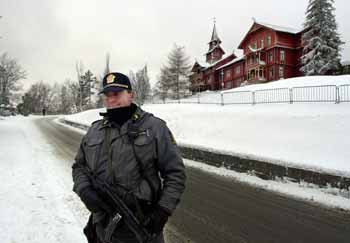 An armed guard stands on the street outside the Holmenkollen Park Hotel in Oslo December 5, 2001. The Nobel Peace Prize Centennial Symposium will be held here from December 6-8. All former Peace Prize laureates are invited to the symposium. [Reuters]