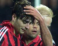 Dimitar Berbatov (L) and Ulf Kirsten of German first division soccer team Bayer 04 Leverkusen celebrates Berbatov's goal against 1860 Munich during their German soccer association (DFB) cup quarter final match in Leverkusen January 30, 2002.