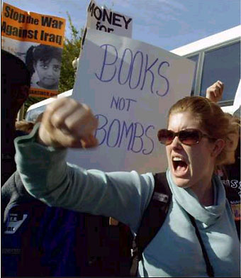 Kate Graves of New York City yells during a protest against U.S. President Bush's proposed war against Iraq in Washington, DC October 26, 2002. Thousands of people took part in the march. [Reuters]