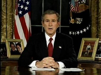"My fellow citizens, at this hour, American and coalition forces are in the early stages of military operations to disarm Iraq, to free its people and to defend the world from grave danger," he said in a televised address. "On my orders, coalition forces have begun striking selected targets of military importance to undermine Saddam Hussein's ability to wage war," he said in the hurriedly announced speech. "These are opening stages of what will be a broad and concerted campaign," he promised. Bush claimed Iraqi leader Saddam Hussein will use women, children and men as human shields to protect his troops. "Saddam Hussein has placed Iraqi troops and equipment in civilian areas, attempting to use innocent men, women and children as shields for his own military, a final atrocity against his people." Bush said in a brief televised address. "In this conflict, America faces an enemy who has no regard for the conventions of war or rules of morality," he said.
