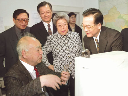Premier Wen Jiabao talks to a medical expert as he inspects the Chinese Center for Disease Control and Prevention on April 6, 2003. Wen said that the Chinese government had contained the spread of atypical pneumonia, known as Severe Acute Respiratory Syndrome (SARS). [Xinhua]