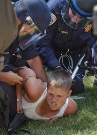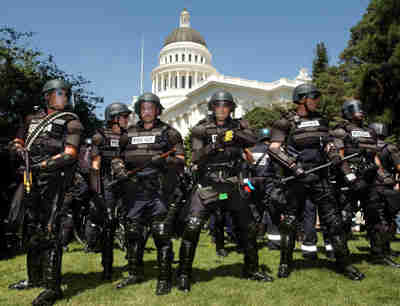 "We're being poisoned," said Shenaaz Janmohamed, 23, a student at Cal State Sacramento. "You can't play God and think you can make nature," said Kaira Espinosa, 23, of Oakland. Several protesters came with their children. "I want the children to know what is going on with the food supply," said Kofi Khemet, 45, who brought his three daughters, ages 7, 9 and 13. "I'm scared to eat," the 9-year-old said. Inside the Capitol, all was quiet. The Assembly met for less than an hour to quickly approve Senate amendments on several bills, then separated into Democratic and Republican caucuses. The afternoon was marked by a series of relatively minor run-ins, as protesters gathered for a rally in the Capitol park. Arrests Foiled At one point, a few dozen Highway Patrol officers encircled two groups of self-described anarchists dressed in black. Within moments, a larger crowd of protesters surrounded the officers. The police, avoiding a confrontation, backed off. During the standoff, officers tried to detain a woman. But as they held her by the arms, protesters grabbed onto her ankles in an attempt to pull her free. Police let her go. Downtown merchants were left muttering Monday about a lost business day, as office workers took the day off to avoid any fallout from the mass demonstration on the Capitol steps. Danny Haddad, owner of La Boheme cafe on the K Street Mall, surveyed his empty restaurant shortly before noon and voiced hope that at least a few protesters might wander by for lunch. "They're going to be hungry," he said. "I'll feed anyone as long as they don't break my windows."