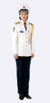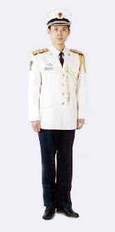 The People's Liberation Army (PLA) began to develop its new generation of service uniforms at the beginning of 1993. The new uniforms were presented to the Central Military Commission (CMC) for approval in 1995. The CMC held a meeting on April 10, 1995 to examine the new uniforms. By the approval of Chairman Jiang Zemin, who examined the new uniforms personally, the new generation of uniforms were first tried on by the PLA Garrison stationed in the Hong Kong Special Administrative Region on May 1, 1997 and were introduced to the three services in the spring of 2000. The new generation of uniforms includes nine items, namely, military dress uniform, spring/autumn military service uniform, summer military service uniform, sweaters, battle dress uniform, physical training dress , caps and decorations, shoes/boots, and bullet-proof vest. Military dress uniform 1. Style: Open-necked coat with picked lapel and square laps. Two lower insert pockets with flap. Toothed-edges (distinguishing type of service) at collar edge, sleeve cuffs and out-seams on trousers. Western-style trousers in dark greenish brown (Army), gray (Navy) or deep sky-blue (Air Force.) 2. Material: Thin whipcord 3. Decorations: Big cap insignia, hard epaulets, collar insignias, tie, tie bar, service mark tag, identity tag, aiguillette. 4. Cap: Peak hat. 5. Shoes: Leather.
