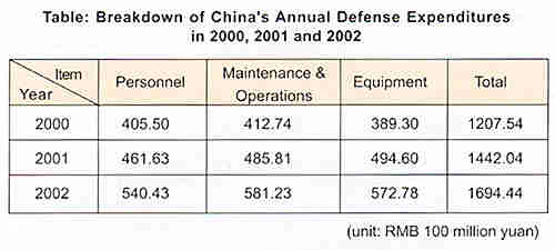China's defense spending was RMB 120.754 billion yuan in 2000, and 144.204 billion yuan in 2001. The budget for defense expenditure in 2002 is 169.444 billion yuan (see table on p. 26), accounting for 7.60%, 7.65% and 8.03% of the state financial expenditure in the same year, respectively.