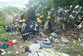 Rescuers search for survivors after the a Hong Kong double-decker bus packed with commuters crashed through an expressway bridge barrier and plunged 35-meters July 10, 2003. The bus crashed into a lorry on Tuen Mun Road before running off Ting Kau bridge near Tuen Mun Village and plunged down a slope, killing 22 people and injuring 20. [newsphoto.com.cn]