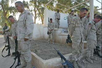 Soldiers of the 3rd Infantry Division pay their respects at a memorial service for Spc. Joel Bertoldie, of Independence, Mo, at the US army base in Habbaniya, Iraq, Sunday July 20, 2003. Bertoldie was killed when a bomb was detonated beneath his vehicle in Fallujah, the Department of Defense said Saturday. [AP]
