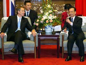Premier Wen Jiabao and Blair hold a 65-minute talks Monday at the Great Hall of the People in Beijing. Both men hailed the momentum of bilateral relations, and Blair said during the talks that he thought highly of the China's way of resolving latest problems in Hong Kong.